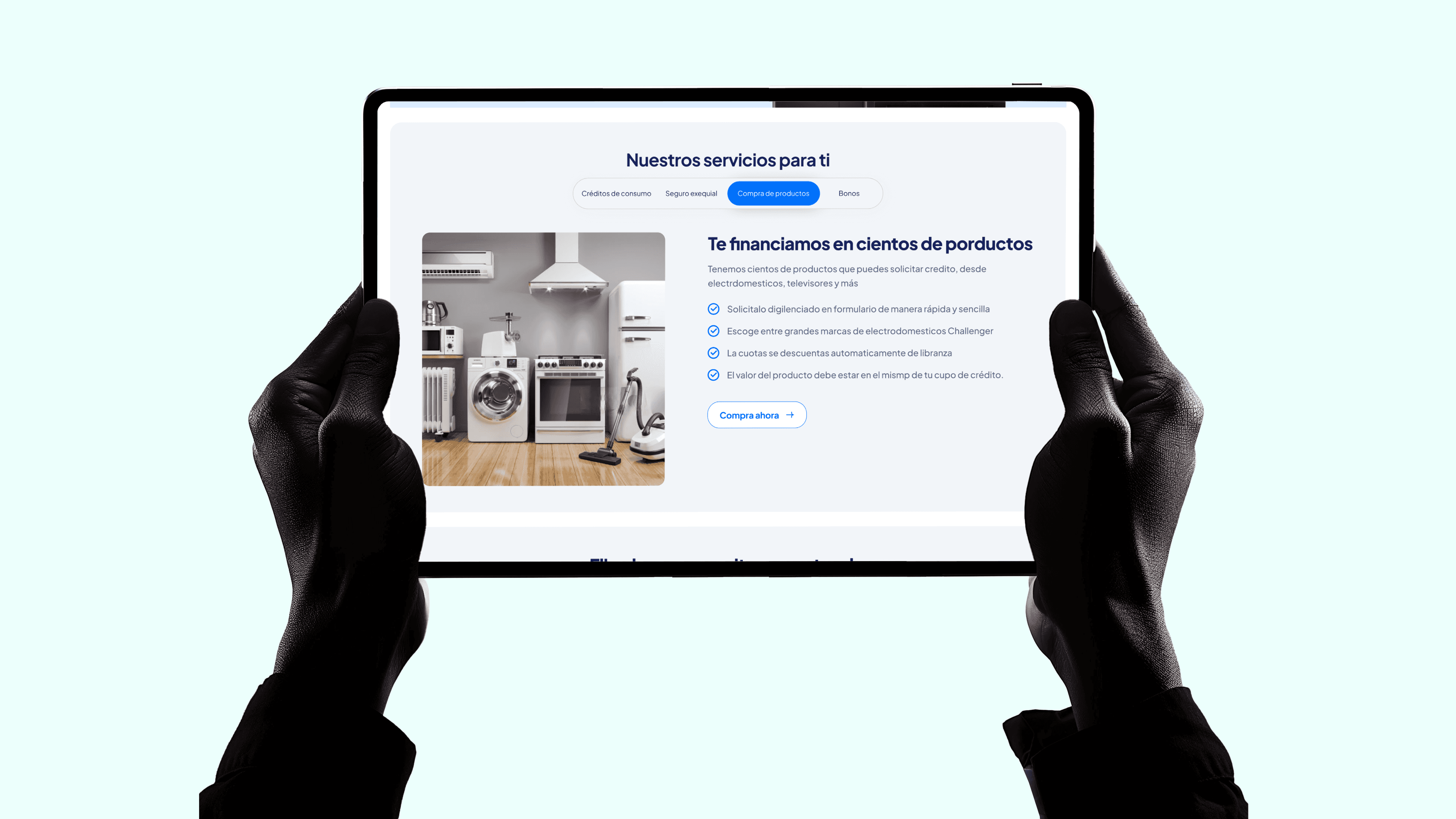 Designed a clean, user-centric digital interface for Comerbas' product financing services. The page effectively communicates the key benefits of their financing options through a minimalist layout, clear iconography, and a compelling visual narrative. By showcasing household appliances and highlighting the simplicity of their credit process, the design transforms a complex financial service into an approachable, user-friendly experience that emphasizes convenience and accessibility. Key design elements include a straightforward value proposition, easy-to-scan benefit checklist, and a prominent call-to-action that guides users towards their financial solution.