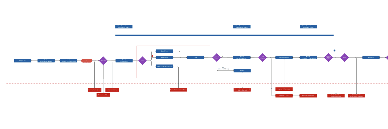 The ideation stage required to develop a user flow, an extensive user flow, comprehending the happy path, plus the e-roll path on all the alternative routes. Plus, we started developing wireframes and started developing prototypes to test again with users the iterations.